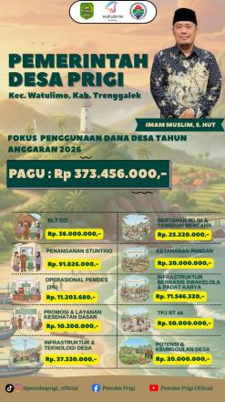 Di bawah kepemimpinan Kepala Desa, Imam Muslim, S.Hut, Desa prigi mengelola pagu anggaran sebesar Rp 373.456.000,- Anggaran ini akan dialokasikan secara strategis untuk mendukung kesejahteraan masyarakat, pembangunan infrastruktur, serta penguatan sektor kesehatan dan ekonomi desa.